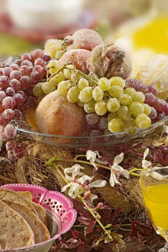 Pois estava eu a mil preparando um jantar informal para amigos, quando reparei que não tinha comprado flores para o centro de mesa, apenas tinha dois pés de orquídeas artificiais. Surgiu-me então a ideia de fazer um centro com frutas que tinha em casa, mas para não parecer um centro de fruta banal, resolvi cristalizar a frio, muito simples.